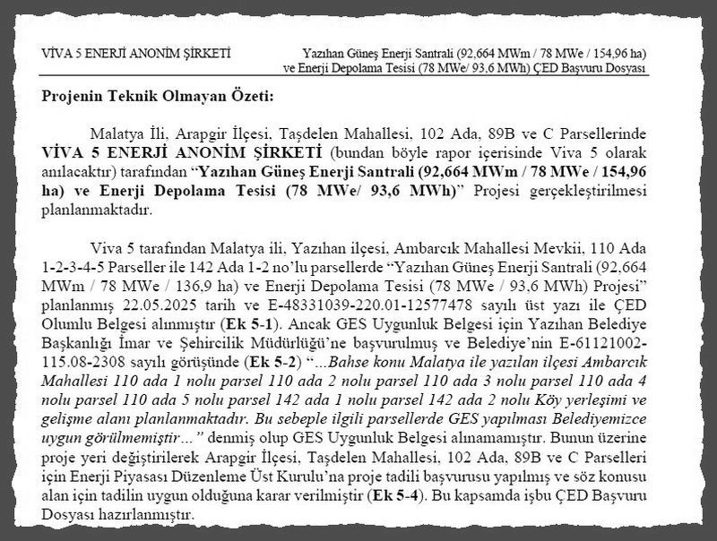 Malatya'nın Yazıhan ilçesinde yaklaşık 1600 dekar verimli tarım arazisini kapsayan enerji yatırımı tartışması, yerel idarenin ve vatandaşların direnciyle yeni bir sürece girdi. Viva 5 Enerji Anonim Şirketi tarafından Ambarcık Mahallesi'nde planlanan 92,6 MWm kurulu gücündeki santral projesi, belediyenin imar planlarını gerekçe göstererek verdiği olumsuz görüş nedeniyle gerçekleştirilemedi.