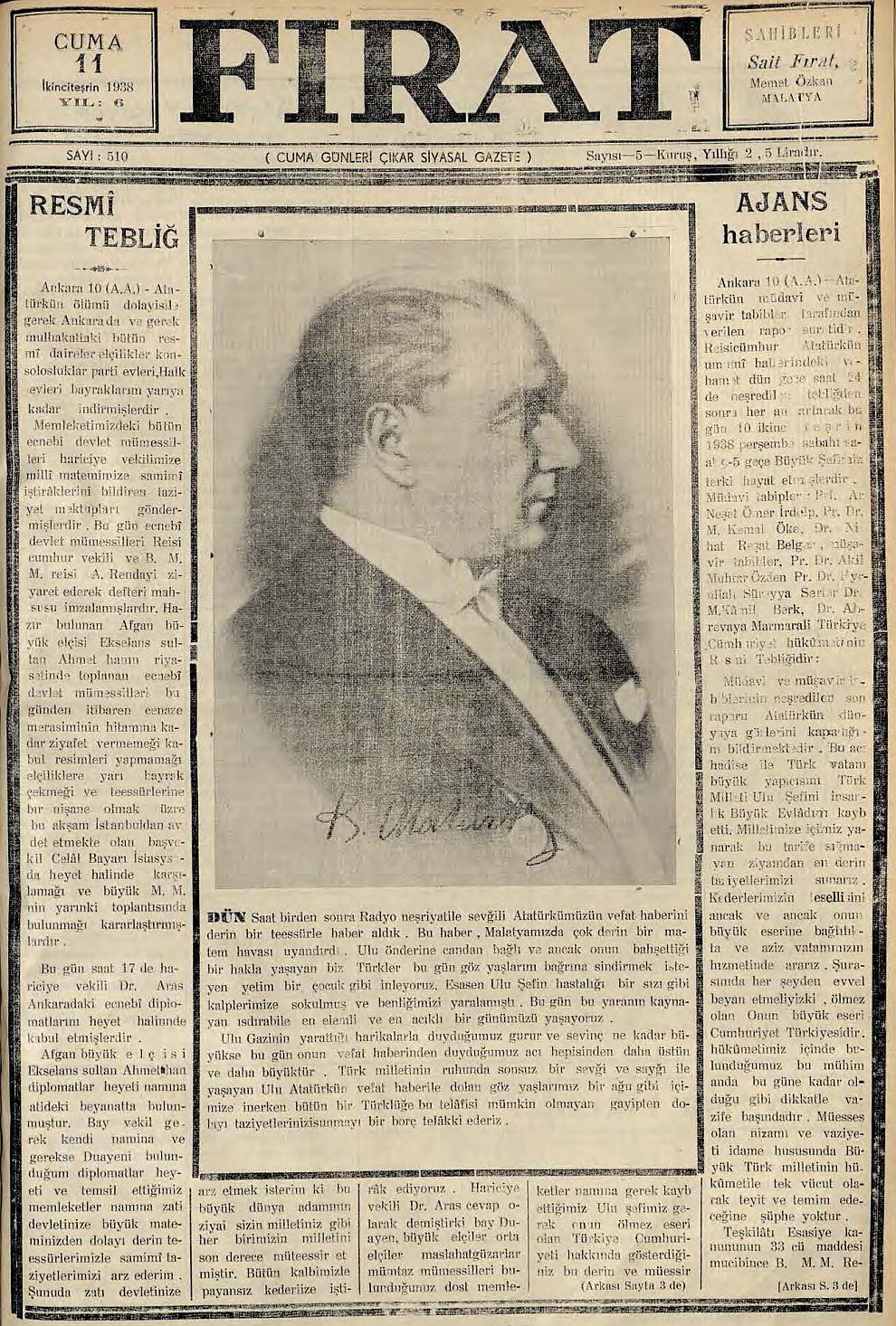 11 Kasım 1938 Cuma günü Malatya’da yayınlanan Fırat Gazetesi de Malatyalının duygularına tercüman olacak şu satırlar ile okuyucularına ulaşıyordu.