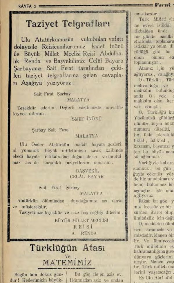 Atatürk’ün vefatı dolayısıyla Malatya Belediye Başkanı Sait Fırat tarafından, Cumhurbaşkanı İsmet İnönü, Başbakan Celal Bayar ve Büyük Millet Meclisi Başkanı Abdulhalik Renda’ya taziye telgrafları gönderilmiş ve bu taziye telgraflarına da teşekkür cevapları gelmiştir.