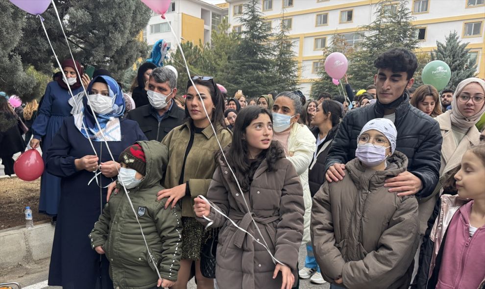 İnönü Üniversitesi Turgut Özal Tıp Merkezi Onkoloji Hastanesi'nin önüne ellerinde balonlarla gelen yüzlerce kişi, Asmin ve Eymen'in mutluluğuna ortak oldu.