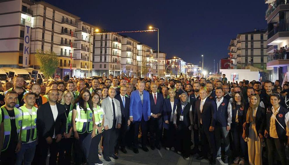 Bugün Malatya'da 300 bininci konutun anahtarının teslim edildiğini belirten Erdoğan, "'Hükümet bu enkazın altında acaba ne zaman kalacak' umuduyla tam 2,5 yıldır bekleyen deprem turistlerini bir kez daha hüsrana uğratıyoruz. Şunu da büyük bir gururla ifade etmek isterim. Bugün itibarıyla deprem bölgesindeki her 3 hak sahibi vatandaşımızdan 2'sini yeni yuvasına kavuşturmuş oluyoruz." ifadelerini kullandı.