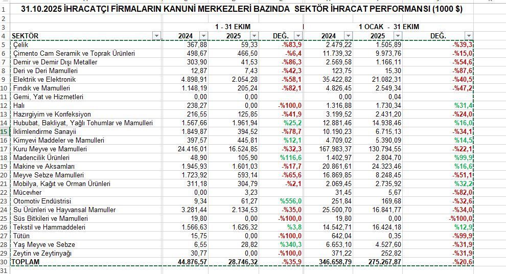 TİM tarafından Ekim 2025 dönemine ilişkin “İhracatçı firmaların kanuni merkezleri bazında sektör ihracat performansı” rakamlarını açıkladı.