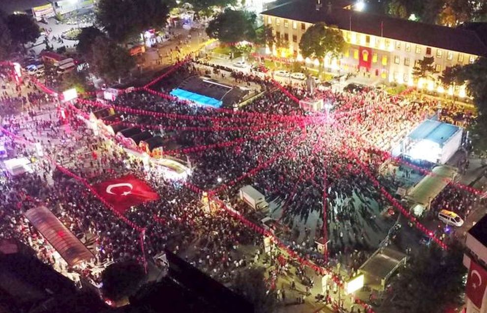 ARŞİV FOTOĞRAF: Hükümet Meydanı, düzenleme adı altında garip saksılar, bir meydan için uygunsuz demir korkuluklar yerleştirilmeden önce, çok uzun yıllar Malatya'dın miting alanı işlevini yerine getirdi. Aşağıdaki fotoğrafta, meydanın bu amaçlı kullanımlarından biri olan, FETÖ Silahlı Terör Örgütü'nün 15 Temmuz 2016'daki hain darbe girişimi sonrasında haftalarca süren gösterilerin yapıldığı bir gece görülüyor. Onbinlerce kişi, kurulmuş bir sahne düzeni, insan için tehdit oluşturmayan bir fiziki mekan iken, son düzenlemelerle adeta bu işlevine son verildi.