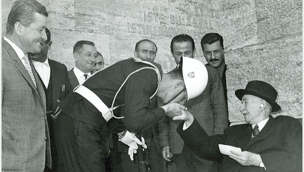 KAPAK FOTOĞRAFI: Merhum İsmet İnönü, Anıtkabir'deki bir törende bir askere elini öptürürken, kendisine eşlik eden grup da Malatya'dan bir heyet..