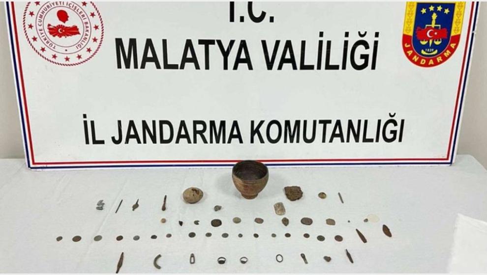 Malatya İl Jandarma Komutanlığına bağlı Kaçakçılık ve Organize Suçlarla Mücadele Şube Müdürlüğü ve Doğanşehir İlçe Jandarma Komutanlığı ekipleri, tarihi eser kaçakçılığına yönelik operasyonda 21 sikke, 3 yüzük, 18 obje ve 1 şarap kadehi ele geçirdi.