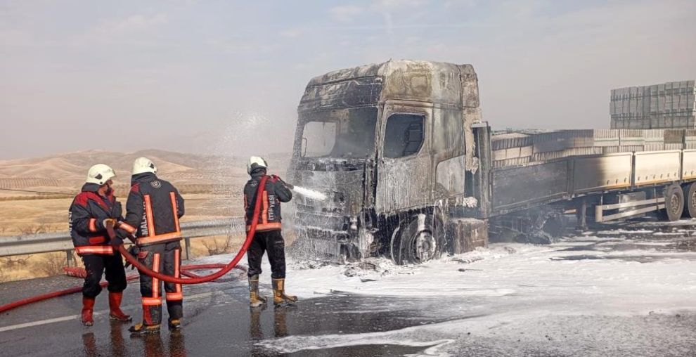 Malatya-Elazığ Karayolu Kale ilçesi mevkiinde inşaat malzemesi yüklü bir tırda çıkan yangın, itfaiye ekiplerince söndürüldü.