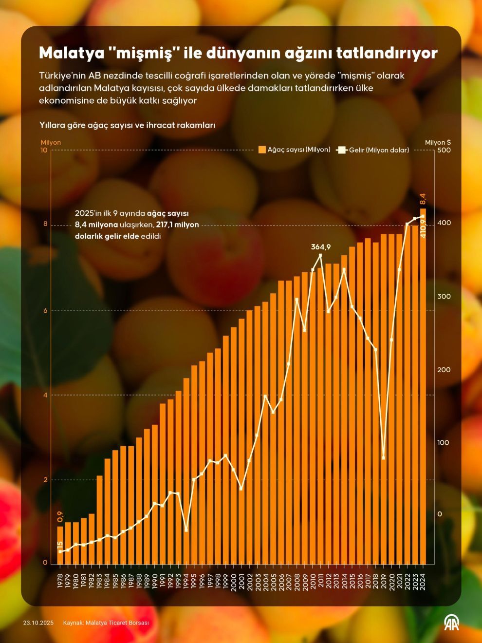 İlk kayısı ihracat verilerinin kaydedildiği 1978'de, 893 bin 350 ağaçtan 37 bin 10 ton yaş kayısı üretilen Malatya'da geçen yıl 8 milyon 425 bin kayısı ağacından 690 bin 730 ton yaş kayısı elde edildi.