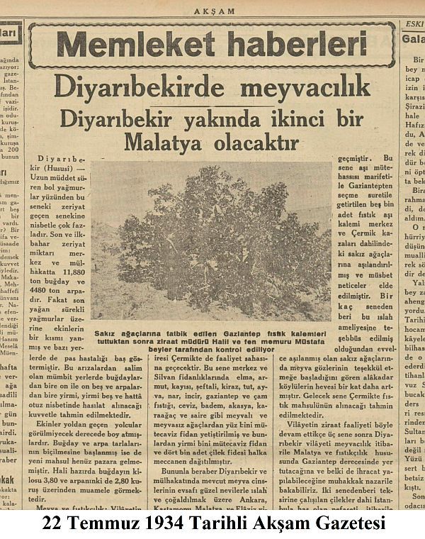 22 Temmuz 1934 tarihli Akşam gazetesinde yer alan “Diyarbakır’ın meyve üretiminde yakın zamanda ikinci bir Malatya olmayı hedeflediği” başlıklı haber meyve yetiştiriciliği alanında daha o tarihte Malatya’nın geldiği noktayı göstermesi açısından son derece çarpıcıdır. Habere göre meyvecilik alanında vilayetin yaptığı ziraat faaliyetleri böyle devam ederse Diyarbakır, 3-5 yıl içinde Malatya kadar önemli bir meyve şehri olacak, hatta ihracat yapabilecek seviyeye ulaşacaktır.