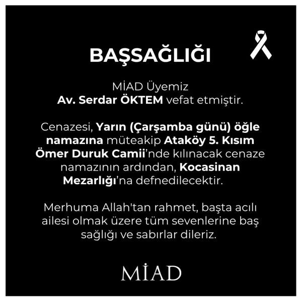Merkezi İstanbul'da bulunan Malatyalı İş Adamları (İnsanları) Derneği- MİAD, üyeleri olan ve İstanbul'da dün uğradığı silahlı saldırı sonucu öldürülen Avukat Serdar Öktem için, başsağlığı mesajı yayınladı.