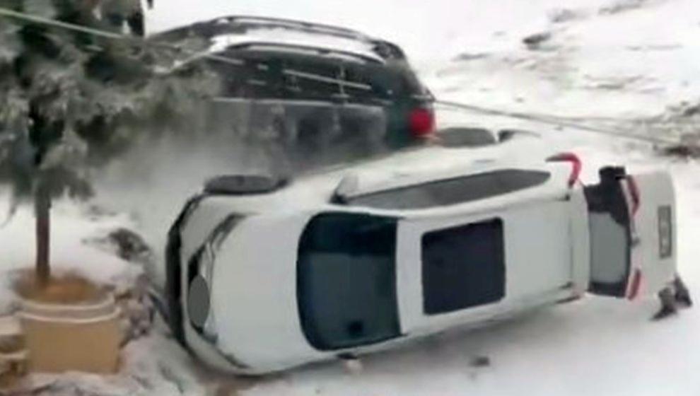 Malatya'da kar yağışı ve buzlanma nedeniyle kayan aracın park halindeki aracı devirdiği kaza cep telefonu kameralarına yansıdı.
