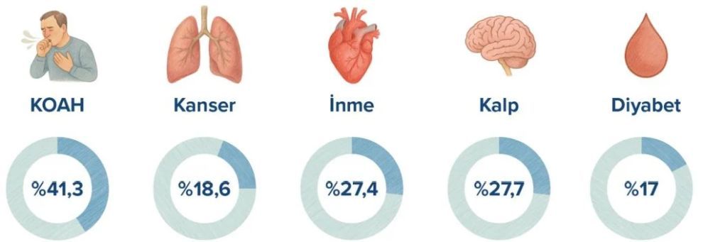 İnce partikül madde PM2.5 kirliliğinin, dünyada toplam hastalıkların yüzde 8’inden ve yılda 7,8 milyon erken ölümden sorumlu olduğunun, özellikle solunum ve dolaşım sistemi hastalıklarına yol açtığının belirtildiği Kara Rapor 2025’te şu veriler dikkat çekiyor: KOAH’a bağlı ölümlerin yüzde 41,3’ü, iskemik kalp hastalıklarına bağlı ölümlerin yüzde 27,7’si, inme kaynaklı ölümlerin yüzde 27,4’ü, akciğer kanserine bağlı ölümlerin yüzde 18,6’sı, diyabete bağlı ölümlerin yüzde 17’si PM2.5 kirliliğinin sonucu. Kirlilik, kronik böbrek hastalığı, nörolojik hastalıklar, erken doğum ve ruh sağlığı sorunları gibi riskleri de artırıyor.