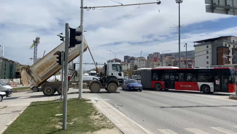 Malatya Çevreyolu'nda seyir halindeki bir kamyon, sürücüsünün açık unuttuğu damperiyle trambüsün elektrik kablolarını kopardı.