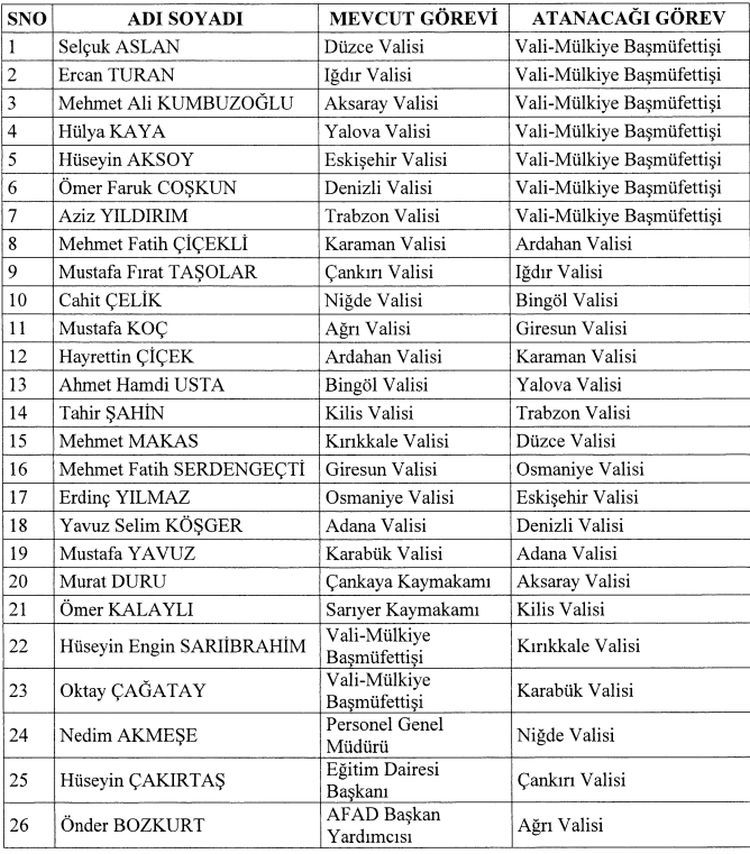 Cumhurbaşkanı Recep Tayyip Erdoğan imzasıyla yayımlanan kararname ile Düzce Valisi Selçuk Aslan, Iğdır Valisi Ercan Turan, Aksaray Valisi Mehmet Ali Kumbuzoğlu, Yalova Valisi Hülya Kaya, Eskişehir Valisi Hüseyin Aksoy, Denizli Valisi Ömer Faruk Coşkun ve Trabzon Valisi Aziz Yıldırım, "vali-mülkiye başmüfettişliği" görevine getirildi.